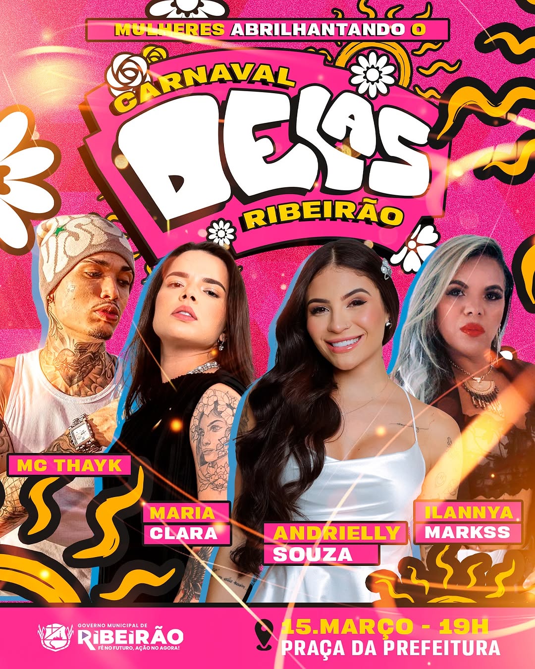 Sábado, dia 15 de março, é a vez delas fazerem aquela festa! Vamos lotar a praça e fazer uma festa linda, de paz, alegria e respeito. A partir das 19h estaremos esperando todos vocês.